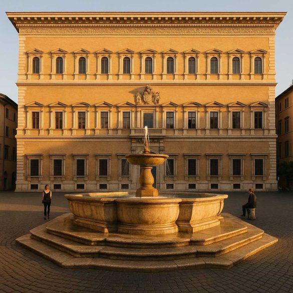 Il palazzo domina una delle più eleganti piazze di Roma, un’area che nel corso dei secoli ha mantenuto intatto il suo fascino. Di fronte alla costruzione si trova una fontana monumentale, alimentata da antichi condotti d’acqua provenienti dalle terme di Caracalla. L’armonia tra architettura e spazio urbano crea un effetto scenografico di grande impatto, un vero esempio di come il Rinascimento concepisse la città come un teatro della vita pubblica.